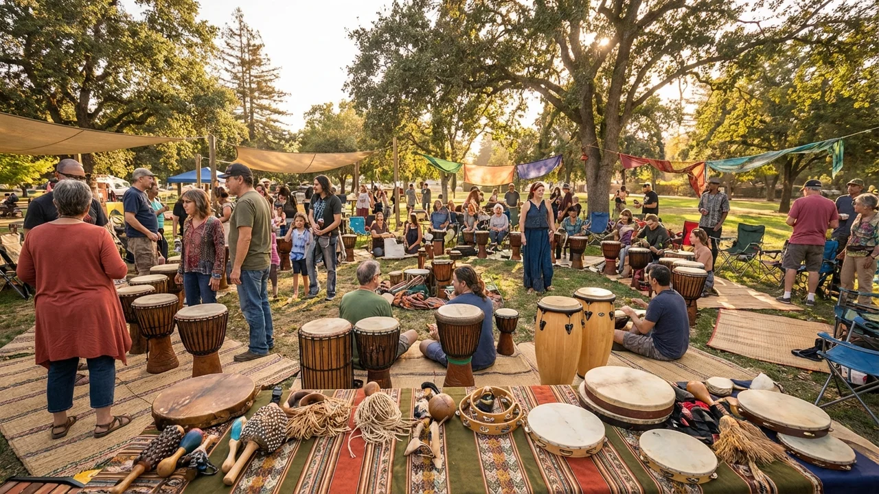 A 6-person drum circle set featuring handcarved djembes and West African percussion, complete with a facilitation guide for group music-making.